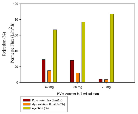 Figure 6 shows that increasing the amount of PVA in the coating solution leads to a decrease in the pure water and dye solution flux, and this decrease was steep at higher values. In other words, thickening the membrane skin layer with increasing the amount of PVA leads to increased methylene blue rejection.
