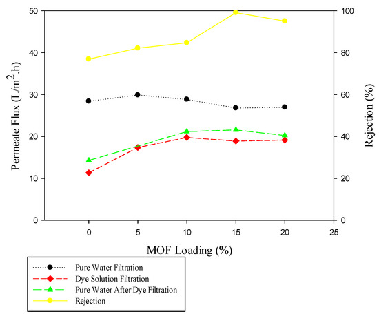 It is clear that the dye rejection increased up to 99.08% for PM0.8-15 with MOF loading until 15%. It also projected acceptable permeability (approximately 18.90 L/m2·h), high rejection, and low fouling resistance, making it the most ideal membrane fabricated in this study. This membrane (P0.8-15) rejected 30.41% of AlCl3 polyvalent ion from an aqueous solution. According to the results, the performance of the membrane made in this study is competitive with the results of many studies in the field of dye separation and can be used in dye purification in industry [51,52].