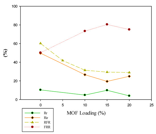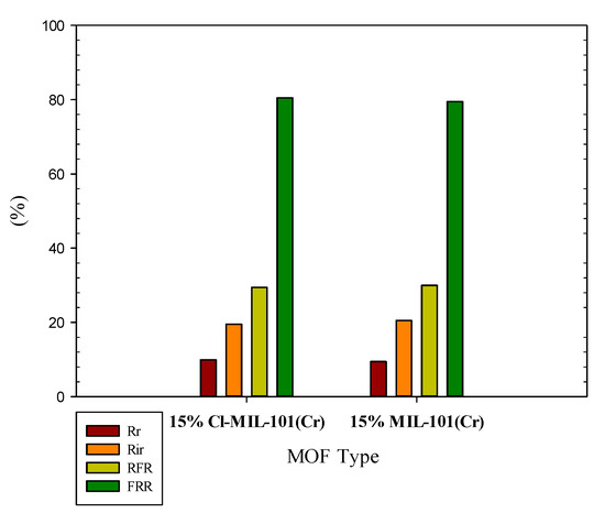 Examination of other membrane parameters related to antifouling properties and cleaning efficiencies such as reversible and irreversible resistances, relative flux reduction, and flux reversal ratio were depicted in Figure 9 and Figure 10. The results show that the addition of cationic M101 reduce the irreversible fouling resistance and the flux drop of the membranes. Therefore, it can be expected that in the long-term tests, dye solution permeates for the membranes fabricated with up to 15% cationic MOF as filler is associated with higher stability and was at a high level for a more extended period. Moreover, the membrane constructed with the initial MOF had more irreversible resistance and a lower flux ratio than that of modified positive MOF.
