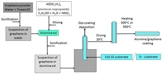 Alumina/graphene nanocomposite coatings were manufactured by the sol–gel method using a suspension of reduced graphene oxide (rGO) powder in alumina sol. Aluminum isopropoxide (Sigma-Aldrich, >98%, Steinheim, Germany) was used as a precursor for the preparation of the sol. The precursor was added to water at a temperature higher than 95 °C, acidified with nitric acid. The concentration of precursor in the sol was 0.7 mol/L.