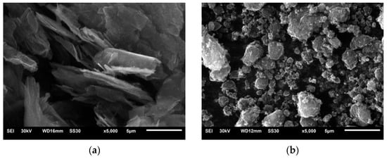 SEM images of both types of rGO powder: (a) G1 and (b) G2. Magnification 5000×.