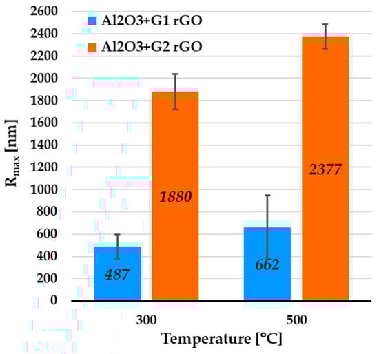 The profiles were calculated in order to determine the height of the protruding rGO particles and agglomerates. For the Al2O3 + G1 coatings annealed at 300 °C and 500 °C, the average Rmax values were 487 nm and 662 nm, respectively (Figure 6). In the case of the Al2O3 + G2 coatings, the respective average Rmax values were 1880 nm and 2377 nm. Despite the identical coating deposition parameters, the average Rmax was over 3.5 times higher for the Al2O3 coatings with the addition of G2 rGO.