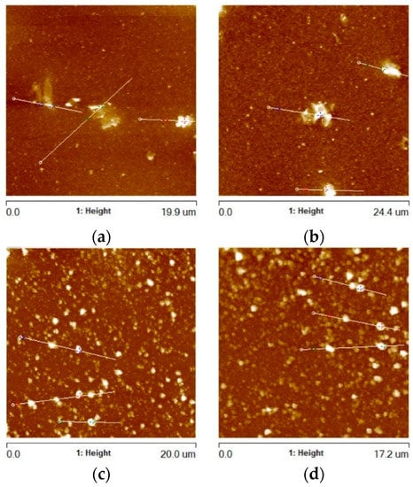 The anisotropic spatial arrangement of rGO nanoplates observed during the SEM research was also analyzed using atomic force microscopy (AFM). In the places where the largest rGO nanoplate agglomerates were found, linear scans (profiles) were conducted, registering the Rmax parameter (the greatest height of unevenness along the measurement line). Example AFM images of these areas are shown in Figure 5, while the collected Rmax data for all variants of the coatings are shown in Figure 6.