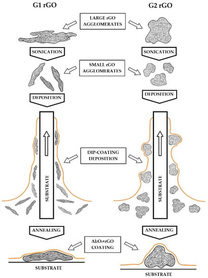 Schematic representation of the formation of G1 and G2 rGO nanoplate agglomerate arrangement during dip-coating deposition. Sizes of agglomerates not to scale.