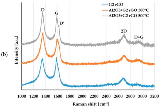 Raman spectra of: (a) G1 rGO powder and Al2O3 + G1 rGO coatings annealed at 300 °C and 500 °C; (b) G2 rGO powder and Al2O3 + G2 rGO coatings annealed at 300 °C and 500 °C.