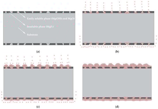 - Due to the special characteristics of Mg–Li alloy material, to be used as a substrate it must be activated with fluoride first. This led to the formation of the surface initial state with Mg(OH)2 and MgO as the easily soluble phase and MgF2 as the insoluble phase on the sample surface. At the first stage, the region where the easily soluble phase was concentrated took the lead in dissolving and forming the catalytic core of Ni and started depositing. Meanwhile, the region where the insoluble phase was concentrated dissolved slowly, leading to a time difference of the deposition reaction in different regions.