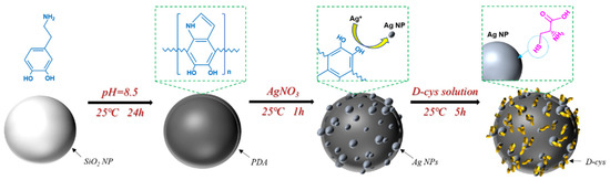 The Stöber method was used to prepare SiO2 nanoparticles with a particle size of approximately 600 nm [36]. Dry SiO2 nanoparticles were added to 400 mL Tris-HCl buffer solution (10 mM, pH = 8.5) containing dopamine hydrochloride (2.0 mg/mL), with the pH value of 8.5, and the solution was stirred slowly at a speed of 100 rpm/min for 24 h. Afterwards, the polydopamine (PDA)-coated nanoparticles were immersed in 400 mL AgNO3 solution (5.0 mg/mL) and stirred slowly at 100 rpm/min for 1 h. During the AgNO3 treatment, the conical flask containing the AgNO3 solution and nanoparticles was completely wrapped in tin foil to protect it from light. The Ag-deposited nanoparticles were then added to 400 mL D-cys solution (10.0 mmol/L) and stirred at 100 rpm/min for 5 h. After washing with deionized water, the preparation of antibacterial nanoparticles was completed. The above steps were all performed at room temperature. The preparation process is shown in Figure 1.