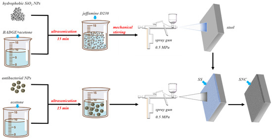 Q235 carbon steels with a dimension of 10 mm × 10 mm × 3 mm were polished by abrasive papers until reaching 800 grit, followed by washing with ethyl alcohol under ultrasonic treatment and drying in air. A total of 1.2 g of hydrophobic KH550-modified SiO2 nanoparticles and 3.0 g of BAGDE were added to 30 mL of acetone. After 20 min of sonication at temperature, 1.0 g of Jeffamine D230 was added under mechanical stirring. The mixture solution was sprayed on the carbon steel surface using a spray gun with an air pressure of 0.5 MPa. After 5 times of spraying, the rough polymer-based superhydrophobic substrate was established. Subsequently, 1.0 g of antibacterial nanoparticles was added to 20 mL of acetone and dispersed by ultrasonic treatment for 15 min at temperature, followed by spraying on the superhydrophobic substrate. After curing at 45 °C for 24 h, the superhydrophobic nanocomposite coating was obtained. The whole preparation process is shown in Figure 2. The superhydrophobic substrate and final superhydrophobic nanocomposite coating are hereinafter referred to as SS and SNC.