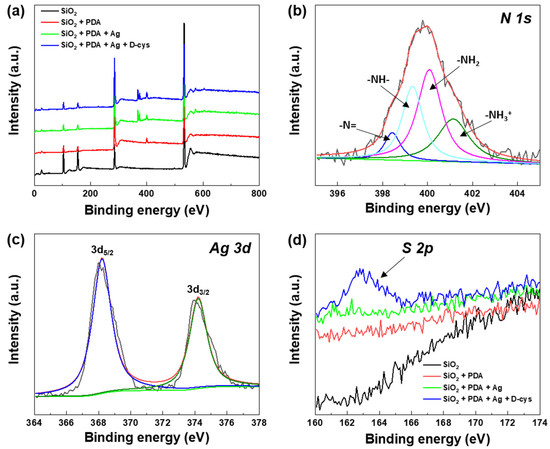 To further determine the successful fabrication of antibacterial nanoparticles, the chemical compositions of the nanoparticle surfaces after different fabrication steps were characterized by XPS, as shown in Figure 4. After treatment with dopamine hydrochloride, the peak of N appeared on the spectrum at the binding energy of approximately 400 eV (Figure 4a). The high-resolution spectrum of N element was fitted with four peaks at the binding energies of ~401.1 eV, ~400.0 eV, ~399.3 eV, and ~398.4 eV, which were associated with the –NH3+, –NH2, –NH–, and –N = groups in polydopamine structure [43,44] (Figure 4b). It indicated the successful encapsulation of polydopamine membrane. After treatments with AgNO3, the peaks of Ag can be observed clearly on the spectrum at the binding energy of approximately 370 eV. Furthermore, the high-resolution Ag 3d spectrum in Figure 4c was divided into two peaks at the binding energies of ~374.2 eV and ~368.3 eV, which were attributed to Ag3d5/2 and Ag3d3/2, respectively [45,46]. When the D-cys was modified on the surface of nanoparticles, a peak of S element appeared at the binding energy of approximately 162.5 eV (Figure 4d), which was related to the Ag-thiol groups, sulfur, and thiolate in D-cys structure [47,48]. The results of XPS demonstrated that the Ag nanoparticles and the D-cys were successfully grafted on the polydopamine surface. Based on the SEM, TEM, and XPS analysis, the successful preparation of antibacterial nanoparticles was confirmed.