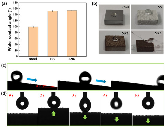 (a) Water contact angle of steel surface, SS, and SNC; (b) photographs of a water droplet on steel surface, SS, and SNC and the video snapshot of the rolling state of water on SNC; (c) video snapshots of the rolling behavior of the water droplet on SNC; (d) video snapshots of the low adhesion behavior of the water droplet on SNC.
