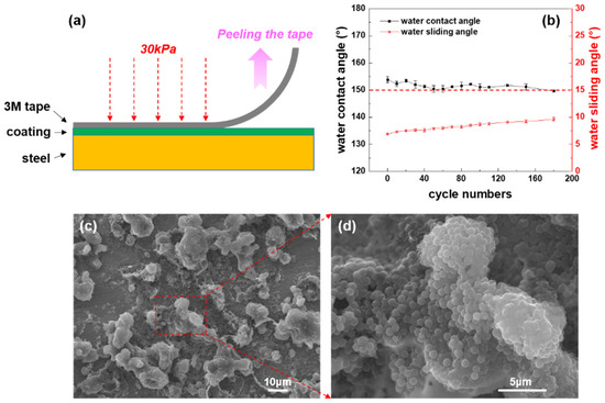 (a) The schematic of the tape-peel tests; (b) variation in the water contact angle and the sliding angle with peeling cycle numbers; (c,d) SEM images of the surface morphologies of the SNC after 180 tape-peeling cycles.