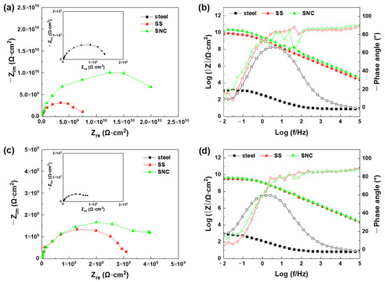 EIS results of the samples after (a,b) 1 day and (c,d) 3 days of immersion in 3.5% NaCl solution.