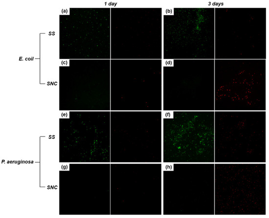 The adhesion conditions of E. coli and P. aeruginosa cells on the sample surfaces after 3 days of immersion in their culture media were also observed by SEM, which are shown in Figure 11. For the SS without antibacterial nanoparticles, obvious bacterial aggregation behavior of E. coli and P. aeruginosa cells appeared after immersing in the culture media for 3 days, and E. coli and P. aeruginosa cells all showed rod shapes with a length between 1 μm and 3 μm (Figure 11a,b,e,f). Although superhydrophobic surface can reduce protein adhesion and resist the attachment of bacterial cells, the antibacterial experimental results of the SS indicated that it cannot be maintained for a long time in the inoculated medium. When the antibacterial nanoparticles were loaded, the bacterial adhesion state on the sample surface changed significantly. After immersing for 3 days, only several adherent bacteria cells could be seen (Figure 11c,d,g,h). The results of SEM and live/death staining showed that the SNC had excellent antibacterial performance during 3 days of incubation against E. coli and P. aeruginosa.