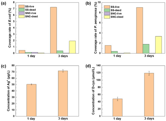 The coverage rates of (a) E. coli and (b) P. aeruginosa on the SS and SNC surfaces after 1 day and 3 days of immersion in the inoculated media; the concentrations of released (c) Ag+ and (d) D-cys from the SNC surface after 1 day and 3 days of immersion in the LB medium.