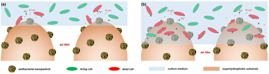 The schematic figure of the antibacterial behavior of the superhydrophobic nanocomposite coating on the (a) first day and (b) third day.