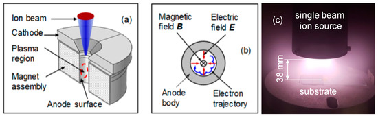Ion sources are plasma generation devices that enable ion beams to interact with the materials at the atomic level as they are deposited to effectively modulate the film microstructure [21,22,23,24,25]. In the ion-source-enhanced growth of a-C:H, the ion source produces plasma from hydrocarbon gas, such as methane. The plasma breaks the hydrocarbon molecules and creates various radicals that form amorphous carbon coatings. Since the pioneering work of Aisenberg and Chabot [26], ion beam deposition of amorphous carbon thin films has continuously advanced with the development of ion sources. Two major types of ion sources have been widely used for thin-film processing, gridded and end-Hall ion sources [27,28]. The gridded ion source has a relatively low current and high ion energy (e.g., >300 eV), which usually leads to large stress and graphitization of the carbon films. Gridless end-Hall ion sources can produce ions with a wide range of average energy (e.g., 40–200 eV) at a much higher current than gridded ion sources. These characteristics are beneficial for the high-rate deposition of dense a-C:H films. The requirement for a closed-loop drift of the electrons in end-Hall ion sources leads to circular or racetrack beam patterns, while some applications would demand the ions to be focused onto a specific area. Furthermore, end-Hall ion sources have a narrow ion-emitting slit, which could be coated quickly, resulting in unstable discharges.