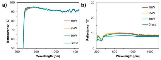 where t is the thickness of the coating. The optical bandgap values were estimated from the Tauc plot shown in Figure 6. The predicted optical bandgap was around 3.7 eV. The deposition power had little effect on the optical bandgap of the coatings.