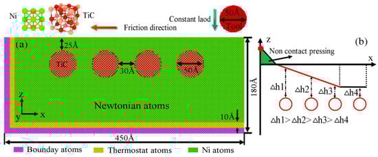 In the study, a large-scale atomic/molecular parallel simulator (LAMMPS) [29] is to be used to perform molecular dynamics simulations. Analogue output analysis is via OVITIO visualization software [30]. Figure 1a shows the established MD simulation model, which contains a rigid spherical diamond grinding ball and a TiC/Ni composite material matrix. The TiC/Ni composite material consists of two base units, the TiC phase and Ni phase, and the Ni phase serves as the matrix of the composite material. First, the Ni phase MD model was established with FCC crystalline structure with the lattice constant of 3.524. Next, four spherical pores were introduced to accommodate the TiC phase nanofillers, where the crystal structure and lattice constant of TiC are face-centered cubic lattice and 4.33 Å, respectively [31]. In addition, reinforcement particles are considered to be evenly distributed spheres, which has been widely used in MD simulations [32,33]. The distribution and geometric characteristics of the introduced TiC phases are shown in Figure 1a, to better visualize the details of the model, the model was cut along the [010] direction, and four spherical TiC phases were uniformly distributed in the Ni matrix with a diameter of 50 Å, 25 Å from the surface, and a distance of 30 Å between the TiC phases. The simulation, in which a constant load is applied to the grinding ball at the microscopic level, and linear friction is made along the [−100] direction, enables a systematic study of the deformation behaviors throughout the process from the start of material contact until compaction, and also reflects the protective effect of reinforced phase on the material at different depths relative to the grinding ball, as shown in Figure 1b. Based on the proposed model, the nano-scale wear characteristics of TiC/Ni composites can be investigated in depth.