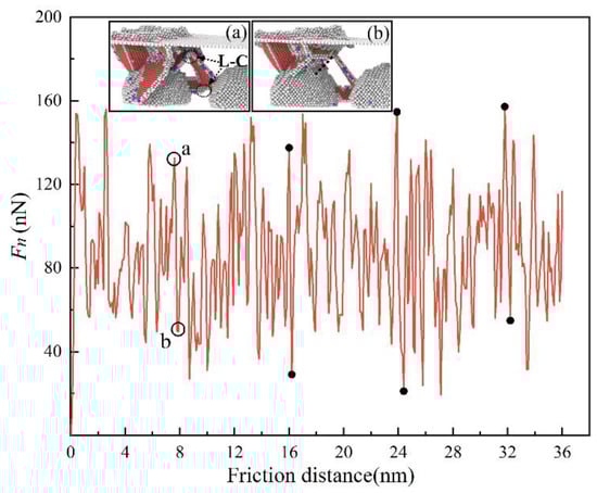 To accurately study the mechanical properties of the material throughout the friction process, the normal force Fn between the grinding ball and the workpiece was extracted, as shown in Figure 2. It can be seen that Fn fluctuates up and down around a constant value throughout the friction process. The fluctuations are mainly related to the presence of the TiC phase. When the grinding ball frictions directly above the TiC phase, the defect at the lower end of the grinding ball nucleates and develops towards the inside of the workpiece. However, when the development of the defect encounters the TiC phase, the defect is not able to pass through the TiC phase and a relatively stable L-C dislocation is formed between the TiC phases, resulting in a continuous energy build-up in the action region, which makes the Fn increase. With the continued action of the grinding ball on the workpiece, maximum values of Fn occur, as shown in Figure 2a. However, when the grinding ball friction through the TiC phase, the Fn decreases sharply, with a minimum value appearing at point “b”. The main reason for the fact is that the original stable dislocation at the lower end of the grinding ball is destroyed at this time and the resistance to the grinding ball is reduced, resulting in a decrease of Fn. This indicates that the presence of the TiC phase leads to a significant increase in the normal force Fn, which helps to improve the deformation resistance of the material.
