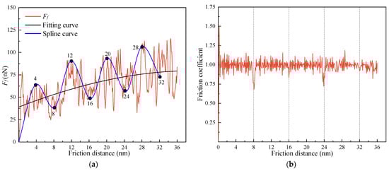 Figure 3a presents the dynamic response curve of the friction force Ff with the friction distance. It can be seen that as the friction distance increases, the fitted curve of Ff first increases rapidly and then gradually stabilizes. This can be attributed to the rapid increase in the workpiece atoms in contact with the grinding ball at the initial friction, leading to a rapid increase in the Ff. With the increase in friction distance, the workpiece atoms in contact with the grinding ball continue to increase, and the rate of increase in Ff gradually decreases, as shown by the black line in Figure 3a. When the applied constant load is not sufficient to drive the grinding ball in the z-direction, the final Ff fitted value will level off.