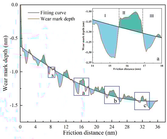 To accurately analyze the effect of the presence of the TiC phase on friction during the friction process, four regions containing the TiC phase were selected, as shown in Figure 4a–c,s. As shown in Figure 4a, one can see that the depth of the abrasion marks in stages I and III continues to increase, while the depth of the abrasion marks in stage II is shallower than that in stages I and III. This is for reasons of the different lattice constants of the matrix nickel and TiC, when the matrix atoms are subjected to the downward action of the grinding ball, they tend to slip downwards at the interface between the two phases, resulting in an increase in the depth of the abrasion marks. In stage II, however, the grinding ball is located above the TiC phase, at which point the TiC phase as a whole assumes the force of the grinding ball on the workpiece, ultimately leading to a difference in the depth of the abrasion marks. This indicates that the presence of the TiC phase improves the resistance of the workpiece to abrasion. Similarly, there is also the phenomenon of the “a” region that exists when the grinding ball grinds to other locations of the TiC phase, as shown in Figure 4b,c, which is the reason for the near-periodic fluctuation of Ff. However, the distance between the grinding ball and the TiC phase at the beginning of the friction is far away, and the TiC is not significant relative to the role of the workpiece, and a similar law did not emerge, as shown in Figure 4s.