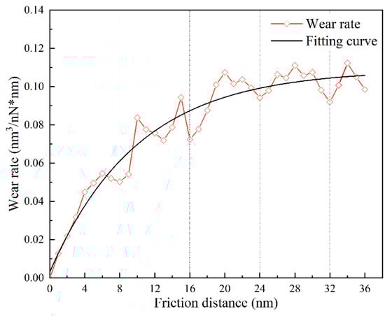 The dynamic curve of the wear rate with friction distance was calculated by Equation (3), while the wear rate data were fitted to observe the effect of the presence of the TiC phase on the wear resistance of the nickel matrix, as shown by the black line in Figure 5. One can see that as the friction distance increases, the fitted curve gradually stabilizes and smaller values of the wear rate occur in the area above and adjacent to the TiC where the grinding ball is located, as shown in Figure 5 at 8, 16, 24, and 32 nm. This indicates that the presence of the TiC phase improves the wear resistance of the workpiece, resulting in a lower wear rate of the material. Additionally, it was found that the frequency of wear rate fluctuations increased with growing friction distance. This is because the distance between the grinding ball and TiC phase keeps getting closer and the relatively high hardness of TiC, the energy between the grinding ball and TiC phase keeps accumulating and releasing, dislocations keep generating and destroying, resulting in the discontinuity of material removal, which makes the frequency of wear rate fluctuation keep increasing.
