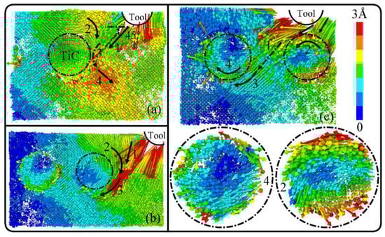 To observe the microscopic deformation behaviors of the workpiece during the friction process, typical atomic displacement vector maps of the workpiece when the grinding ball is located before and above the TiC phase were obtained to color according to the size of the atomic displacement, as shown in Figure 6. One can see that when the grinding ball just contacts the workpiece, the atoms at the lower end of the grinding ball produce a 45° displacement trend along the most likely to slip surface of FCC structure atoms, as shown in Figure 6(a1). However, the motion is hindered when the atoms encounter the TiC phase in motion, as shown in Figure 6(a2,a3). With the relatively large hardness of the TiC phase, the obstacles-cutting case is difficult to happen for the hard obstacles, so the atoms cannot break through the TiC phase to continue in their original direction of motion, resulting in a deflection of the direction of motion of the atoms, as shown in Figure 6(a4). With the friction distance increases, and the grinding ball continuing to move downwards, the effect on the workpiece atoms increases, whereas the atoms are still unable to break through the TiC phase, creating a tendency to move along the outer edge of the TiC phase towards the inside of the workpiece, as shown in Figure 6(b2,b3). Meanwhile, the nickel atoms rub against the atoms on the right side of the TiC phase during the motion, causing the TiC phase atoms to develop a rotational tendency. When more nickel atoms act on the TiC phase, the TiC phase atoms develop a counterclockwise rotational motion, and the immediately following nickel atoms also produce a counterclockwise rotational motion, as shown in Figure 6b. Nevertheless, when the grinding ball is pressed positively against the TiC phase, the TiC phase atoms occur in a clockwise rotational motion, as shown in Figure 6(c2). This is mainly due to the change in the position of the nickel atoms acting on the TiC phase; the atoms at the lower end of the grinding ball act on the upper surface of the TiC phase, and the mutual friction between the nickel and TiC phase atoms causes a clockwise rotational motion of the TiC phase atoms. It is noteworthy that the nickel atoms continue to move in the 45° direction after bypassing the TiC phase, as shown in Figure 6(c1). Similarly, when the grinding ball is located before the next TiC phase, the atoms produce a motion similar to that in Figure 6b, as shown in Figure 6(c3,c4). The above indicates that the TiC phase guides the movement of the atoms inside the workpiece, and the movement of the atoms in the TiC phase absorbs part of the force of the grinding ball on the workpiece, increasing the plastic deformation capacity of the workpiece.