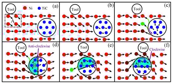 To illustrate the effect of the presence of the TiC phase on the movement of the matrix nickel atoms during the friction process, a schematic diagram of a continuous process in which a grinding ball is ground through the TiC phase is drawn, as shown in Figure 7. When the grinding ball is just in contact with the workpiece the atoms at the lower end of the ball are subjected to an external force, which causes a 45° prone on displacement along its plane of slip, as shown in area A Figure 7a. With the continuous action of the grinding ball, the displaced matrix atoms transfer the displacement tendency to some of the atoms in the TiC phase, as shown in Figure 7b. As the grinding ball moves closer and closer to the TiC phase, the number of nickel atoms acting on the TiC phase continues to increase, which causes the number of atoms displacement in the TiC phase continues to increase, as shown in Figure 7c. However, due to the relatively stable structure of the TiC phase, the nickel atoms cannot break through the TiC phase to maintain the original motion trend, creating a tendency to move around the TiC phase, as shown by the green line in Figure 7. As the growing number of matrix nickel atoms act on the B region of the TiC phase, they drive the TiC phase atoms to produce a counterclockwise rotational motion, and the nickel atoms immediately following the TiC also produce a counterclockwise rotational motion, as shown in Figure 7d. However, when the grinding ball was ground above the TiC phase, the TiC phase atoms and the surrounding nickel atoms produced a clockwise rotational motion. This is mainly due to a change in the area where the nickel atoms act on the TiC phase. When the grinding ball is located above the TiC phase, the nickel atoms at the lower end of the grinding ball act on the C region of the TiC phase, as seen in Figure 7e. Under the continuous friction of the grinding ball, the movement of the matrix nickel atoms below the grinding ball to the right produces continuous friction on the upper surface of the TiC phase, providing energy for the movement of the TiC phase atoms, resulting in the movement of the TiC phase atoms along a clockwise rotation, as shown in Figure 7f. This indicates that the internal atomic motion guided by the TiC phase is related to the position of the grinding ball concerning the reinforced phase.