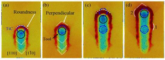 The surface of the wear scar morphology was analyzed to reveal the microscopic behaviors of the TiC/Ni composite during the friction process. Figure 8 shows a top view of the TiC/Ni composite during nano-friction, with the atoms colored according to their height in the z-direction. One can see that when the grinding ball acts on the region without TiC phase, layer dislocations form and propagate in the <110> slip direction, and a large number of chip atoms symmetric distribution on both sides of the wear scar path, with a circular chip profile at the front of the grinding ball, as shown in Figure 8a. However, when the grinding ball acts above the TiC phase, there is a displacement difference between the workpiece surface at the front end of the grinding chip, the front end protrudes at a right angle, as shown in Figure 8b. This indicates that when the grinding ball is located above the TiC phase, violent plastic deformation occurs inside the workpiece, causing a displacement difference on the surface of the workpiece. Similarly, the same law occurs when the grinding ball friction to the next TiC phase, as shown in Figure 8c,d. In addition, it was also found that when the grinding ball was located above the TiC phase, the stacked atoms on both sides appeared asymmetrically distributed, as shown in Figure 8(d1,d2).