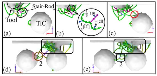 Nucleation, movement, and interaction of dislocations in TiC/Ni composites during friction. The lines are dislocations evolution, where green, blue, pink, light blue, yellow, and red are Shockley, Perfect, Stair-Rod, Frank, Hirth, and other dislocations, respectively. (a–c) denote successive processes where the grinding ball is located in front of the TiC phase, respectively. (d,e) respectively indicate the continuous process where the grinding ball is located directly above the TiC phase.