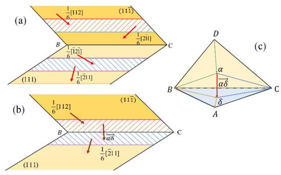 The accumulation of dislocations increases the energy and stress concentration at the contact surface, and the dislocations show different patterns of motion during further plastic deformation. Among them, the Perfect dislocation is decomposed into two Shockley extension dislocations, where the leading dislocations of the two extension dislocations meet on the intersecting slip surfaces. Figure 10 is a schematic diagram of the interaction between the first and second dislocation segments. In the (111) and surface Thompson tetrahedra are represented by ABC and DBC, respectively, as shown in Figure 10c. The two reaction processes of the first dislocation segment in the ABC and DBC planes can be expressed as: