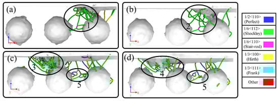 To analyze the influence of the semi-coherent interface on the friction process of TiC/Ni composites, the generation, development, and extension of dislocations during the friction process were investigated and the Dislocation Extraction Algorithm (DXA) in OVITO [52] was used to identify dislocations. Previous studies have shown that the presence of local stress concentrations between the two phases will promote dislocation nucleation [53]. When the grinding ball contacts the workpiece, a large number of Shockley dislocations, with a small amount of Stair-Rod dislocations are generated, as shown in Figure 9a. Since Stair-Rod dislocations are fixed dislocations, they ensure the stability of the dislocation structure during motion and influence the deformation behavior by impeding the dislocation movement [23]. Under the continuous extrusion of the grinding ball, the two dislocations combined to form a new Stair-Rod dislocation, and the original Stair-Rod dislocation was not destroyed, as shown in Figure 9b. The corresponding dislocation interactions are expressed as: