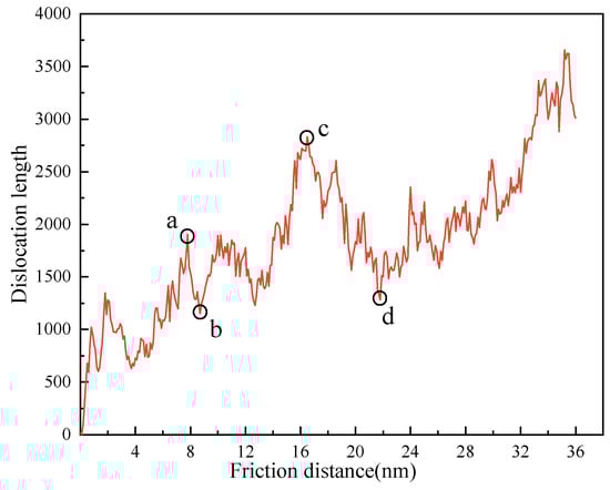 To accurately analyze the variation of the total dislocation length during the friction process, the total dislocation lengths of Shockley, Perfect, Stair-Rod, Frank, Others, and Hirth were counted throughout the process, as shown in Figure 12. Moments 1, 2, 3, and 4 in Figure 12 correspond to moments a, b, c, and d, in Figure 11. One can see that throughout the friction process, the total length of dislocations peaks when the grinding ball is pressed positively against the TiC phase, as shown in Figure 12a,c. When the grinding ball leaves the TiC phase, the total length of dislocation appears as a valley, as shown in Figure 12b,d. Furthermore, the dislocation length can reflect the degree of internal plastic deformation to some extent. Combined with the results of Figure 11, it is further demonstrated that the closer the grinding ball is to the TiC phase, the easier it is to form a dislocation network, which eventually leads to an increase in hardness.