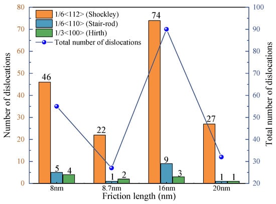 Meanwhile, to analyze the variation law of the number of dislocation bars during the friction process, the number of dislocation bars in a, b, c, and d in Figure 11 was counted, as shown in Figure 13. One can see that the number of Shockley dislocations is significantly higher when the TiC phase is positively pressed by the grinding ball, than when the TiC phase is not subjected to a positive pressure of the grinding ball. This phenomenon is also present in other dislocations, but the variation is not significant. Meanwhile, the closer the grinding ball is to the TiC phase, the more dislocation bars there are and the dislocation density increases. Moreover, the total number of dislocations when the grinding ball is positively pressurized on the TiC phase is also more than that when the grinding ball is not positively pressed. The above results, combined with Figure 11, further demonstrate that dislocation entanglement is easily formed between the grinding balls and TiC, resulting in enhanced deformation resistance of the workpiece.