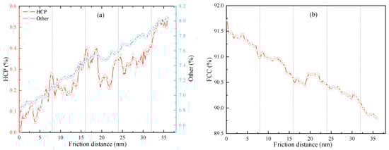 To accurately analyze the variation in the number of defects in the workpiece during the friction process, the proportions of HCP, Other, and FCC in the atomic number of the workpiece were counted separately, using Common Neighbor Analysis (CNA) in OVITO, as shown in Figure 14. One can see that the percentage of amorphous atoms continues to rise throughout the friction process with some fluctuations, as shown in Figure 14a. This is due to the plastic deformation of the intact workpiece under the extrusion of the grinding balls and the accompanying creation and destruction of defects, resulting in a continuous increase in the proportion of amorphous atoms with fluctuations. In addition, a large number of HCP structural atoms are generated between them when the grinding ball is positively pressed against the TiC phase, as shown in Figure 14a, where the grinding ball friction distances are 8, 16, 24, and 32 nm. This indicates the presence of high compressive stresses between the grinding balls and the TiC phase, with a large number of dislocation nucleation to reduce stress concentration. Meanwhile, with the continuous action of the grinding ball on the workpiece, the atoms of single-crystal nickel with FCC structure leave the original lattice sites under the extrusion of the grinding ball and gradually change to BCP, BCC, and amorphous atoms, etc., leading to a decrease in the atomic percentage of FCC structure, as shown in Figure 14b.