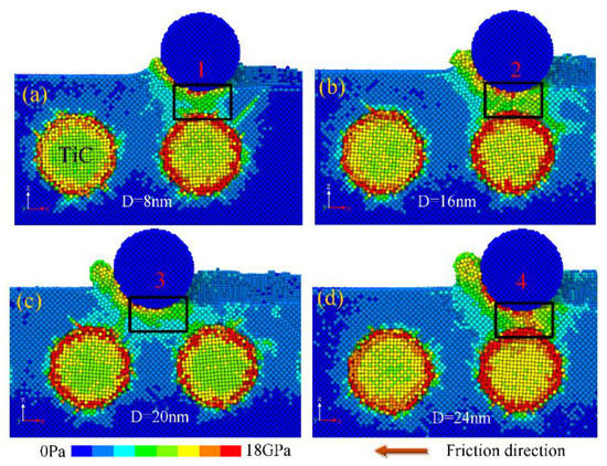 Figure 15 presents the distribution of the von-Mises stresses in the TiC/Ni composites during the nano-friction process. One can see that when the grinding ball first friction to the TiC phase, the region of high von-Mises stress is located between the grinding ball and the TiC phase, in and around the TiC phase, as shown in Figure 15a. With the gradual downward movement of the grinding ball, the stress between the grinding ball and the TiC phase gradually increases, and the atoms gradually change from light green to red, as shown in Figure 15b,d. However, when the grinding ball is located in the TiC-free phase, high von-Mises stress regions only appear near the grinding ball, mainly in light green, as shown in Figure 15c. It is indicated that for TiC/Ni composites, the presence of reinforcements is accompanied by the generation of stress fields in the interfacial region. The more concentrated the stress in part of the region, the easier it is to form a region of high dislocation density, which is consistent with our previous observations in Figure 11. Consequently, the interaction of dislocations strengthens this region, leading to improved properties of the TiC/Ni composites.