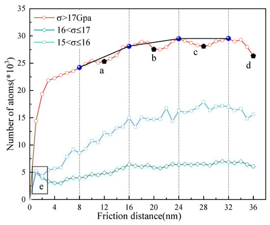 Meanwhile, the change in stress during friction was analyzed and the number of partially stressed atoms was counted, as shown in Figure 16. One can see that when the grinding ball is not located above the TiC phase, valleys appear in the number of high-stress atoms, as shown in points a, b, c and d in Figure 16. When the grinding ball is located above the TiC phase, a peak in the number of highly stressed atoms appears, and the peak gradually increases as the grinding ball gets closer to the TiC phase. However, the number of highly stressed atoms remains almost constant without a large downward shift of the grinding ball, as shown by the black line in Figure 16. In addition, atoms with relatively high stresses are generated when the grinding ball first touches the intact workpiece surface, as shown in area e in Figure 16. The above results combined with Figure 15 further demonstrate the existence of a high-stress region between the grinding ball and TiC.