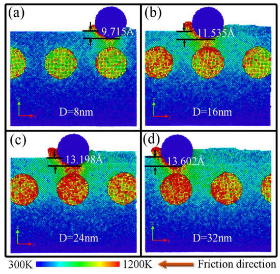 Figure 17 presents the temperature distribution of the workpiece when the grinding ball is in different positions. As shown in Figure 17a, when the grinding ball first grinds into the TiC phase, the friction depth is 9.715 Å. The high-temperature atoms are mainly grinding chips. However, the atomic temperature of the TiC phase is slightly higher than the atomic temperature of the matrix at the same height. This can be attributed to the fact that some of the energy of the atoms during their movement acts directly on the TiC phase. Meanwhile, the TiC blocks the development and extension of defects, resulting in higher temperatures for the TiC atoms. With the increasing friction distance and friction depth, the high-temperature atoms in the upper hemisphere of the TiC phase increase significantly, as shown in Figure 17b. This is because of the getting closer distance between the grinding ball and the TiC phase, the increased action of the grinding ball on the workpiece atoms, the intense movement of the atoms, and the shorter movement distance and weaker energy loss, resulting in more high-temperature atoms in the upper hemisphere of the TiC phase. However, the temperature of the matrix atoms is still lower than the temperature of the TiC atoms at the same height. When the friction distance is 24 nm, the friction depth is 13.198 Å. At this point, the overall atoms of the TiC phase are predominantly high temperature, as shown in Figure 17c. This is due to the closer distance between the grinding ball and the TiC phase, the more intense atomic motion of the squeeze and the constant interaction between the atoms of the TiC phase, resulting in the overall atoms of the TiC phase all changing to high-temperature atoms. Again, the temperature of the matrix atoms remains lower than the temperature of the TiC atoms at the same height. However, when the abrasion depth variation is no longer significant, the atomic temperature of the TiC phase is still dominated by high-temperature atoms, as shown in Figure 17d. It is worth noting that the temperature of the atoms below the TiC phase does not change significantly during the entire friction process.