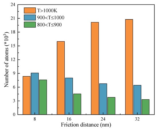 To analyze the variation of atomic temperatures more clearly, the number of atoms at different friction distances and temperatures was counted, as shown in Figure 18. One can see that the number of atoms above 1000 °C increase faster as the friction distance increases. However, when the friction distance exceeds 24 nm, the number of atoms above 1000 °C remains essentially constant, as shown in orange in Figure 18. This is caused by the relative distance between the grinding ball and the TiC phase, the closer the distance, the more high-temperature atoms. Whereas after a friction distance of 24 nm, the relative distance between the grinding ball and the TiC phase remains essentially constant, so the number of high-temperature atoms remains essentially constant. Additionally, the number of atoms stabilizes after a continuous decrease at 800–1000 °C. This is because, after the friction distance of 24 nm, there is no longer a large movement of the grinding ball downward. Meanwhile, there is a heat exchange between the substrate and the outside world, which eventually the friction temperature has a tendency to stabilize. The above results, combined with Figure 17, further indicate that the temperature of the TiC phase atoms during the friction process is above 1000 °C.