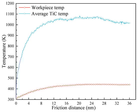 Figure 19 presents the graph of the temperature of the two phases with the friction distance during the friction process. One can see that in the whole process, the average temperature of TiC atoms first rises rapidly and then tends to be stable gradually, and there is a large fluctuation. In addition, the average temperature of TiC atoms is higher than the temperature of the whole workpiece. This can be attributed to the TiC phase impeding the movement of atoms and blocking the development and extension of defects, causing the TiC to generate a large amount of heat, which makes for a higher average TiC phase than the overall workpiece temperature. The temperature fluctuations are mainly caused by the uneven nucleation and development of dislocations and the discontinuity of defects acting on the TiC phase.