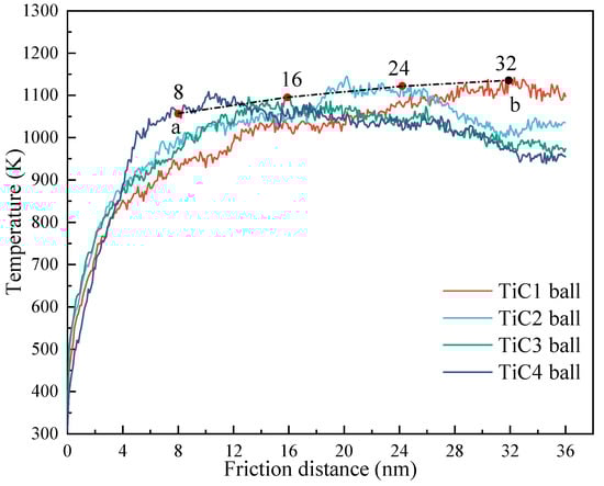 To analyze the variation of the average temperature of the TiC balls with the friction distance, the average temperature of each TiC ball during the friction process was extracted, as shown in Figure 20. Where the order of the grinding balls friction over the TiC balls is TiC4 balls to TiC1 balls, one can see that the average temperature of the TiC4 ball keeps increasing with the increase of the friction distance; however, the temperature starts to drop as the grinding ball has ground through the TiC4 ball. This is mainly because TiC as a strengthening phase absorbs part of the force of the grinding ball on the workpiece, and after the grinding ball leaves the TiC ball, the TiC ball is no longer squeezed by the grinding ball, and the weakening of the surrounding atomic movement, as well as the elastic recovery of the atoms, leads to a weakening of the squeezing of the TiC phase, resulting in a continuous decrease in the average temperature of the TiC ball. Similarly, the same phenomenon occurs for the average temperature of the TiC balls when the friction distance of the grinding balls is 16, 24, and 32 nm, as showed by the indigo, green, and red lines in Figure 20. It is noticeable that the closer the grinding ball is to the TiC phase, the higher the TiC phase is, as shown by the dash line ab in Figure 20.