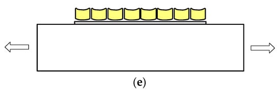 According to the estimates of normal and shear stresses (Equations (1)–(9)) calculated by the proposed analytical model, the fracture mechanisms of the two-layer coating can be described as follows. After tensile tests on coated specimens, the following mechanism of destruction of the two-layer coatings was found, as shown in Figure 5a–e. As the specimen is stretched further (Figure 5a), a crack first appears in the outer ceramic coating at a sufficient distance from the free edge of the coating (Figure 5b). Analysis of the distribution of normal stresses in the σ3 ceramic coating shows that the magnitude of these stresses does not change at 3 mm from the free edge of the coating (Figure 3). Therefore, throughout the area where the σ3 maximum normal stresses occur. The probability of an initial crack in the ceramic coating is almost the same. Continuous specimen stretching leads to the forming of a crack network in the ceramic coating (Figure 5c). As the sample is stretched, the length of the coating fragments decreases until it reaches a critical value (Figure 5d). Then the process of detachment of the coating fragments begins (Figure 5e). After the detachment of the top ceramic coat, cracks appear in the metal sub-coating, which has been observed previously []. The crack penetrates the metal sub-coating when the outer coating has a higher bond strength. In this case, spalling of the outer coating does not occur, as shown in Figure 5b.