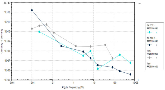This decrease in viscosity was gradual, and consistent with increasing angular frequency, for 5% ZrO2 adhesive. However, 5% TiO2 adhesive also showed lower viscosity compared to the control EA. The viscosities for 5% TiO2 and 5% ZrO2 were overlapping (Figure 5). The EA adhesive showed less decrease in viscosity compared with 5% TiO2 and 5% ZrO2 adhesives. All investigated study adhesives demonstrated non-Newtonian behavior (shear-thinning or pseudo-plasticity). The reduction in viscosity for filler-containing adhesive groups (TiO2 and ZrO2) suggests that the incorporation of particles caused improved fluidity in the resin and filler mixture. It was also observed that even at lower angular frequencies, there was no presence of Newtonian plateau. Although the EA showed higher viscosity compared to particles containing adhesives, this was not a consistent observation and some overlap was seen among the viscosities of the three adhesives at higher frequencies (Figure 5).