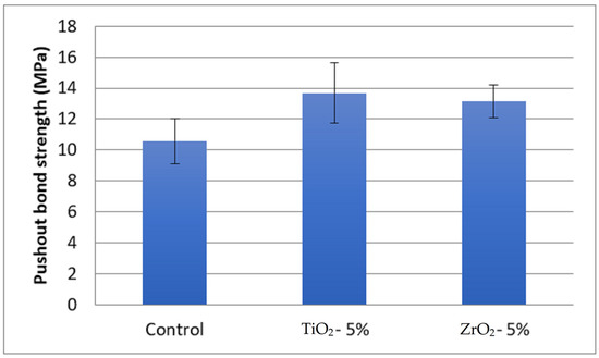The highest push-out bond strength was observed for 5% TiO2 (13.67 ± 1.95 MPa) adhesive and the lowest was in the EA control adhesive (10.57 ± 1.45 MPa) (Table 1). The push-out bond strength in 5% ZrO2 adhesive samples was 13.14 ± 1.08 MPa. The bond strength among the groups was statistically different (p < 0.05). The bond strength in the 5% TiO2 and 5% ZrO2 adhesives was statistically comparable (p > 0.05) (Figure 6). The specimens in the control group (10.57 ± 1.45 MPa) showed significantly lower bond strength values compared to 5% TiO2 (13.67 ± 1.95 MPa) and 5% ZrO2 (13.14 ± 1.08 MPa) adhesives, respectively.