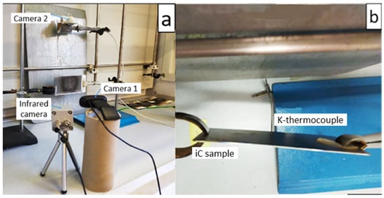 Flame test set-up. Cameras and infrared camera (a), K-thermocouple (b).