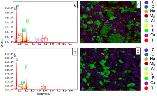 At higher magnifications, an inhomogeneous structure can be noted, as confirmed by the EDX mapping analysis, in particular for iC sample, where some particles agglomerations are present. The EDX analysis detects a greater amount of well distributed phosphorous in APiC sample, due to the presence of a higher percentage of ammonium polyphosphate (compare Figure 4a,b). The images reported in Figure 4 refer to the SEM images in Figure 3a,b respectively. The peaks mainly refer to C and O, amenable to the organic matrix, but to added melamine and pentaerythritol, also. Peaks of Mg, Na, Al, Ti, Ca and Si are furthermore evident, due to the presence of metals oxides and silica, in particular for iC sample (Figure 4c). TiO2, as it is well known, can improve the thermal performance and char morphology of the intumescent coating [24]. In Figure 4d, the EDX mapping of APiC sample is reported. In this case, C, O and P are the more visible elements, as confirmed by the EDX spectrum in Figure 4b. The higher amount of P (compare Figure 3e,f) and, consequently, the larger scale of the y-axis in Figure 4b makes peaks of the other filler components less evident.