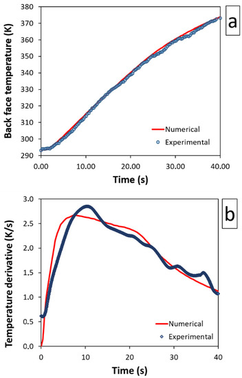 Time evolution of experimentally-observed (symbols) and numerically-computed (lines) data: (a) back-face temperature and (b) its time derivative.