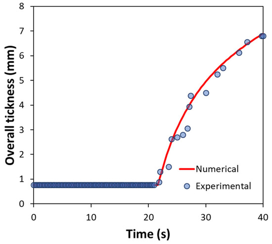 A similar agreement between experimental and simulated data holds for the evolution of the overall thickness of ablative and growing layers, as shown in Figure 9. Indeed, for T < Ts (namely for t < 20.8 s), the overall thickness is kept fixed at g(t) − xsteel = xabla = 0.76 mm, whereas, for T > Ts, the overall thickness increases substantially by even one order of magnitude, reaching the value of about 7 mm, as confirmed by the data reported in Table 2, in which the thickness of the APiC sample at 40 s, when the activation of the intumescence process has been reached, is 6.6 mm.