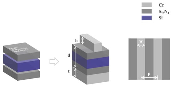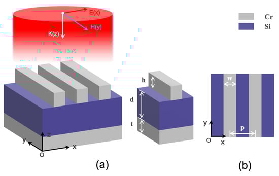 We first developed a MIM absorber that comprises upper metal resonators, a metal plane bottom, and a dielectric layer in the middle, as depicted in Figure 1. Based on previous studies [34,35], we chose a metal grating resonator, which acts well as a polarization selector for selectively trapping incident TM- and TE-polarized light. In terms of material selection, we chose Cr for both the resonators and the plane bottom. On the one hand, chromium (Cr) exhibits plasmon resonance in the infrared range, enabling absorption enhancement [36]; on the other hand, as a high-loss metal, Cr has a particularly large refractive index imaginary part, which makes Cr suitable for light absorption [37,38]. In the metamaterial design, we combine the plasmonic behavior and intrinsic loss of Cr to achieve high absorption in ultra-broadband. In particular, the Cr grating resonators play an important role in the process of LSP excitation; specifically, the incident light excites the LSPR of the resonators, so it is limited around the resonator and produces a near-field enhancement effect, which greatly improves the interaction between light and materials and further enhances the absorption. The middle dielectric layer is formed by the commonly used Si material, which can be well integrated into detection and imaging devices.