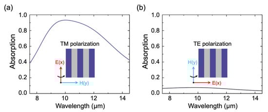 The absorption spectra of the absorber are shown in Figure 2a,b. Under TM-polarized light, the absorber has an absorption peak located at 10.0 µm, and the absorptance reaches 93.2%, as shown in Figure 2a by the purple solid line. In contrast to this, under TE-polarized light, there is almost no absorption in the entire LWIR atmospheric window.